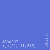 Цвет #596FD7 в цветовой модели RGB обозначается тремя октетами (89, 111, 215) в десятичном формате и #596FD7 в шестнадцатиричном (hex) формате, которые являются интенсивностью красного 89 (hex 59), интенсивность зелёного 111 (hex 6F) и интенсивность синего 215 (hex D7).
