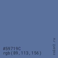 Цвет #59719C в цветовой модели RGB обозначается тремя октетами (89, 113, 156) в десятичном формате и #59719C в шестнадцатиричном (hex) формате, которые являются интенсивностью красного 89 (hex 59), интенсивность зелёного 113 (hex 71) и интенсивность синего 156 (hex 9C).