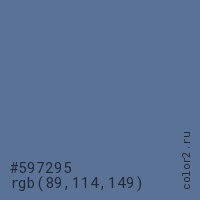 Цвет #597295 в цветовой модели RGB обозначается тремя октетами (89, 114, 149) в десятичном формате и #597295 в шестнадцатиричном (hex) формате, которые являются интенсивностью красного 89 (hex 59), интенсивность зелёного 114 (hex 72) и интенсивность синего 149 (hex 95).