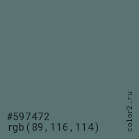 Цвет #597472 в цветовой модели RGB обозначается тремя октетами (89, 116, 114) в десятичном формате и #597472 в шестнадцатиричном (hex) формате, которые являются интенсивностью красного 89 (hex 59), интенсивность зелёного 116 (hex 74) и интенсивность синего 114 (hex 72).
