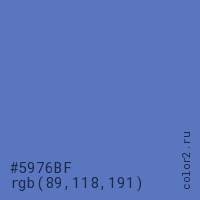 Цвет #5976BF в цветовой модели RGB обозначается тремя октетами (89, 118, 191) в десятичном формате и #5976BF в шестнадцатиричном (hex) формате, которые являются интенсивностью красного 89 (hex 59), интенсивность зелёного 118 (hex 76) и интенсивность синего 191 (hex BF).
