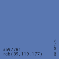 Цвет #5977B1 в цветовой модели RGB обозначается тремя октетами (89, 119, 177) в десятичном формате и #5977B1 в шестнадцатиричном (hex) формате, которые являются интенсивностью красного 89 (hex 59), интенсивность зелёного 119 (hex 77) и интенсивность синего 177 (hex B1).