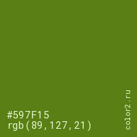 Цвет #597F15 в цветовой модели RGB обозначается тремя октетами (89, 127, 21) в десятичном формате и #597F15 в шестнадцатиричном (hex) формате, которые являются интенсивностью красного 89 (hex 59), интенсивность зелёного 127 (hex 7F) и интенсивность синего 21 (hex 15).