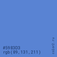 Цвет #5983D3 в цветовой модели RGB обозначается тремя октетами (89, 131, 211) в десятичном формате и #5983D3 в шестнадцатиричном (hex) формате, которые являются интенсивностью красного 89 (hex 59), интенсивность зелёного 131 (hex 83) и интенсивность синего 211 (hex D3).