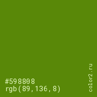 Цвет #598808 в цветовой модели RGB обозначается тремя октетами (89, 136, 8) в десятичном формате и #598808 в шестнадцатиричном (hex) формате, которые являются интенсивностью красного 89 (hex 59), интенсивность зелёного 136 (hex 88) и интенсивность синего 8 (hex 08).