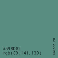 Цвет #598D82 в цветовой модели RGB обозначается тремя октетами (89, 141, 130) в десятичном формате и #598D82 в шестнадцатиричном (hex) формате, которые являются интенсивностью красного 89 (hex 59), интенсивность зелёного 141 (hex 8D) и интенсивность синего 130 (hex 82).