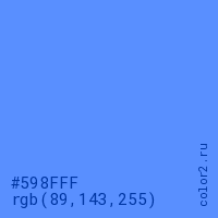 Цвет #598FFF в цветовой модели RGB обозначается тремя октетами (89, 143, 255) в десятичном формате и #598FFF в шестнадцатиричном (hex) формате, которые являются интенсивностью красного 89 (hex 59), интенсивность зелёного 143 (hex 8F) и интенсивность синего 255 (hex FF).