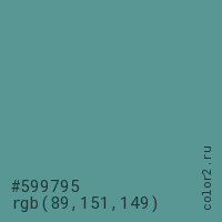 Цвет #599795 в цветовой модели RGB обозначается тремя октетами (89, 151, 149) в десятичном формате и #599795 в шестнадцатиричном (hex) формате, которые являются интенсивностью красного 89 (hex 59), интенсивность зелёного 151 (hex 97) и интенсивность синего 149 (hex 95).