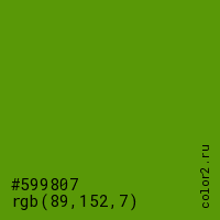 Цвет #599807 в цветовой модели RGB обозначается тремя октетами (89, 152, 7) в десятичном формате и #599807 в шестнадцатиричном (hex) формате, которые являются интенсивностью красного 89 (hex 59), интенсивность зелёного 152 (hex 98) и интенсивность синего 7 (hex 07).