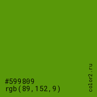 Цвет #599809 в цветовой модели RGB обозначается тремя октетами (89, 152, 9) в десятичном формате и #599809 в шестнадцатиричном (hex) формате, которые являются интенсивностью красного 89 (hex 59), интенсивность зелёного 152 (hex 98) и интенсивность синего 9 (hex 09).