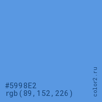 Цвет #5998E2 в цветовой модели RGB обозначается тремя октетами (89, 152, 226) в десятичном формате и #5998E2 в шестнадцатиричном (hex) формате, которые являются интенсивностью красного 89 (hex 59), интенсивность зелёного 152 (hex 98) и интенсивность синего 226 (hex E2).