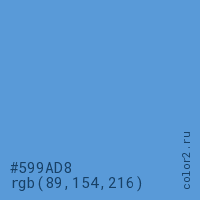 Цвет #599AD8 в цветовой модели RGB обозначается тремя октетами (89, 154, 216) в десятичном формате и #599AD8 в шестнадцатиричном (hex) формате, которые являются интенсивностью красного 89 (hex 59), интенсивность зелёного 154 (hex 9A) и интенсивность синего 216 (hex D8).