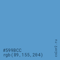 Цвет #599BCC в цветовой модели RGB обозначается тремя октетами (89, 155, 204) в десятичном формате и #599BCC в шестнадцатиричном (hex) формате, которые являются интенсивностью красного 89 (hex 59), интенсивность зелёного 155 (hex 9B) и интенсивность синего 204 (hex CC).