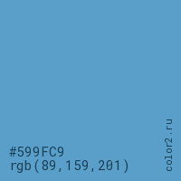 Цвет #599FC9 в цветовой модели RGB обозначается тремя октетами (89, 159, 201) в десятичном формате и #599FC9 в шестнадцатиричном (hex) формате, которые являются интенсивностью красного 89 (hex 59), интенсивность зелёного 159 (hex 9F) и интенсивность синего 201 (hex C9).