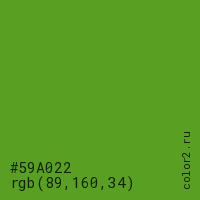 Цвет #59A022 в цветовой модели RGB обозначается тремя октетами (89, 160, 34) в десятичном формате и #59A022 в шестнадцатиричном (hex) формате, которые являются интенсивностью красного 89 (hex 59), интенсивность зелёного 160 (hex A0) и интенсивность синего 34 (hex 22).