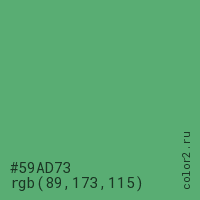 Цвет #59AD73 в цветовой модели RGB обозначается тремя октетами (89, 173, 115) в десятичном формате и #59AD73 в шестнадцатиричном (hex) формате, которые являются интенсивностью красного 89 (hex 59), интенсивность зелёного 173 (hex AD) и интенсивность синего 115 (hex 73).