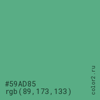Цвет #59AD85 в цветовой модели RGB обозначается тремя октетами (89, 173, 133) в десятичном формате и #59AD85 в шестнадцатиричном (hex) формате, которые являются интенсивностью красного 89 (hex 59), интенсивность зелёного 173 (hex AD) и интенсивность синего 133 (hex 85).
