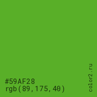 Цвет #59AF28 в цветовой модели RGB обозначается тремя октетами (89, 175, 40) в десятичном формате и #59AF28 в шестнадцатиричном (hex) формате, которые являются интенсивностью красного 89 (hex 59), интенсивность зелёного 175 (hex AF) и интенсивность синего 40 (hex 28).