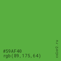 Цвет #59AF40 в цветовой модели RGB обозначается тремя октетами (89, 175, 64) в десятичном формате и #59AF40 в шестнадцатиричном (hex) формате, которые являются интенсивностью красного 89 (hex 59), интенсивность зелёного 175 (hex AF) и интенсивность синего 64 (hex 40).