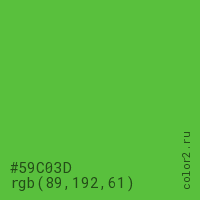 Цвет #59C03D в цветовой модели RGB обозначается тремя октетами (89, 192, 61) в десятичном формате и #59C03D в шестнадцатиричном (hex) формате, которые являются интенсивностью красного 89 (hex 59), интенсивность зелёного 192 (hex C0) и интенсивность синего 61 (hex 3D).