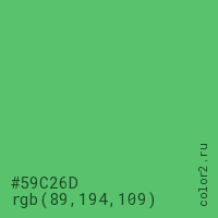 Цвет #59C26D в цветовой модели RGB обозначается тремя октетами (89, 194, 109) в десятичном формате и #59C26D в шестнадцатиричном (hex) формате, которые являются интенсивностью красного 89 (hex 59), интенсивность зелёного 194 (hex C2) и интенсивность синего 109 (hex 6D).