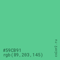 Цвет #59CB91 в цветовой модели RGB обозначается тремя октетами (89, 203, 145) в десятичном формате и #59CB91 в шестнадцатиричном (hex) формате, которые являются интенсивностью красного 89 (hex 59), интенсивность зелёного 203 (hex CB) и интенсивность синего 145 (hex 91).