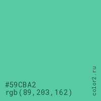 Цвет #59CBA2 в цветовой модели RGB обозначается тремя октетами (89, 203, 162) в десятичном формате и #59CBA2 в шестнадцатиричном (hex) формате, которые являются интенсивностью красного 89 (hex 59), интенсивность зелёного 203 (hex CB) и интенсивность синего 162 (hex A2).