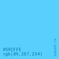 Цвет #59CFFE в цветовой модели RGB обозначается тремя октетами (89, 207, 254) в десятичном формате и #59CFFE в шестнадцатиричном (hex) формате, которые являются интенсивностью красного 89 (hex 59), интенсивность зелёного 207 (hex CF) и интенсивность синего 254 (hex FE).