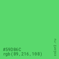 Цвет #59D86C в цветовой модели RGB обозначается тремя октетами (89, 216, 108) в десятичном формате и #59D86C в шестнадцатиричном (hex) формате, которые являются интенсивностью красного 89 (hex 59), интенсивность зелёного 216 (hex D8) и интенсивность синего 108 (hex 6C).