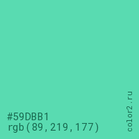 Цвет #59DBB1 в цветовой модели RGB обозначается тремя октетами (89, 219, 177) в десятичном формате и #59DBB1 в шестнадцатиричном (hex) формате, которые являются интенсивностью красного 89 (hex 59), интенсивность зелёного 219 (hex DB) и интенсивность синего 177 (hex B1).