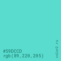 Цвет #59DCCD в цветовой модели RGB обозначается тремя октетами (89, 220, 205) в десятичном формате и #59DCCD в шестнадцатиричном (hex) формате, которые являются интенсивностью красного 89 (hex 59), интенсивность зелёного 220 (hex DC) и интенсивность синего 205 (hex CD).