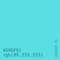 Цвет #59DFE1 в цветовой модели RGB обозначается тремя октетами (89, 223, 225) в десятичном формате и #59DFE1 в шестнадцатиричном (hex) формате, которые являются интенсивностью красного 89 (hex 59), интенсивность зелёного 223 (hex DF) и интенсивность синего 225 (hex E1).