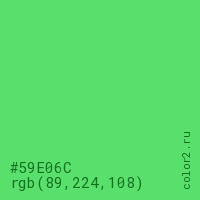 Цвет #59E06C в цветовой модели RGB обозначается тремя октетами (89, 224, 108) в десятичном формате и #59E06C в шестнадцатиричном (hex) формате, которые являются интенсивностью красного 89 (hex 59), интенсивность зелёного 224 (hex E0) и интенсивность синего 108 (hex 6C).