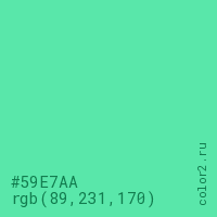 Цвет #59E7AA в цветовой модели RGB обозначается тремя октетами (89, 231, 170) в десятичном формате и #59E7AA в шестнадцатиричном (hex) формате, которые являются интенсивностью красного 89 (hex 59), интенсивность зелёного 231 (hex E7) и интенсивность синего 170 (hex AA).