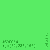Цвет #59EC64 в цветовой модели RGB обозначается тремя октетами (89, 236, 100) в десятичном формате и #59EC64 в шестнадцатиричном (hex) формате, которые являются интенсивностью красного 89 (hex 59), интенсивность зелёного 236 (hex EC) и интенсивность синего 100 (hex 64).