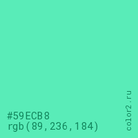 Цвет #59ECB8 в цветовой модели RGB обозначается тремя октетами (89, 236, 184) в десятичном формате и #59ECB8 в шестнадцатиричном (hex) формате, которые являются интенсивностью красного 89 (hex 59), интенсивность зелёного 236 (hex EC) и интенсивность синего 184 (hex B8).