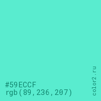 Цвет #59ECCF в цветовой модели RGB обозначается тремя октетами (89, 236, 207) в десятичном формате и #59ECCF в шестнадцатиричном (hex) формате, которые являются интенсивностью красного 89 (hex 59), интенсивность зелёного 236 (hex EC) и интенсивность синего 207 (hex CF).