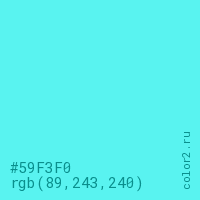 Цвет #59F3F0 в цветовой модели RGB обозначается тремя октетами (89, 243, 240) в десятичном формате и #59F3F0 в шестнадцатиричном (hex) формате, которые являются интенсивностью красного 89 (hex 59), интенсивность зелёного 243 (hex F3) и интенсивность синего 240 (hex F0).
