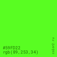 Цвет #59FD22 в цветовой модели RGB обозначается тремя октетами (89, 253, 34) в десятичном формате и #59FD22 в шестнадцатиричном (hex) формате, которые являются интенсивностью красного 89 (hex 59), интенсивность зелёного 253 (hex FD) и интенсивность синего 34 (hex 22).