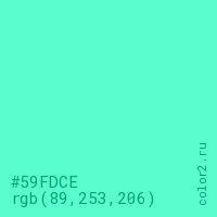 Цвет #59FDCE в цветовой модели RGB обозначается тремя октетами (89, 253, 206) в десятичном формате и #59FDCE в шестнадцатиричном (hex) формате, которые являются интенсивностью красного 89 (hex 59), интенсивность зелёного 253 (hex FD) и интенсивность синего 206 (hex CE).