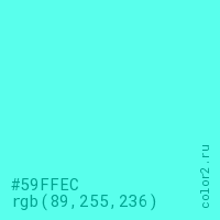 Цвет #59FFEC в цветовой модели RGB обозначается тремя октетами (89, 255, 236) в десятичном формате и #59FFEC в шестнадцатиричном (hex) формате, которые являются интенсивностью красного 89 (hex 59), интенсивность зелёного 255 (hex FF) и интенсивность синего 236 (hex EC).
