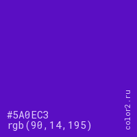 Цвет #5A0EC3 в цветовой модели RGB обозначается тремя октетами (90, 14, 195) в десятичном формате и #5A0EC3 в шестнадцатиричном (hex) формате, которые являются интенсивностью красного 90 (hex 5A), интенсивность зелёного 14 (hex 0E) и интенсивность синего 195 (hex C3).