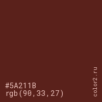 Цвет #5A211B в цветовой модели RGB обозначается тремя октетами (90, 33, 27) в десятичном формате и #5A211B в шестнадцатиричном (hex) формате, которые являются интенсивностью красного 90 (hex 5A), интенсивность зелёного 33 (hex 21) и интенсивность синего 27 (hex 1B).
