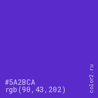 Цвет #5A2BCA в цветовой модели RGB обозначается тремя октетами (90, 43, 202) в десятичном формате и #5A2BCA в шестнадцатиричном (hex) формате, которые являются интенсивностью красного 90 (hex 5A), интенсивность зелёного 43 (hex 2B) и интенсивность синего 202 (hex CA).