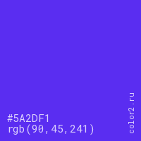 Цвет #5A2DF1 в цветовой модели RGB обозначается тремя октетами (90, 45, 241) в десятичном формате и #5A2DF1 в шестнадцатиричном (hex) формате, которые являются интенсивностью красного 90 (hex 5A), интенсивность зелёного 45 (hex 2D) и интенсивность синего 241 (hex F1).
