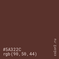 Цвет #5A322C в цветовой модели RGB обозначается тремя октетами (90, 50, 44) в десятичном формате и #5A322C в шестнадцатиричном (hex) формате, которые являются интенсивностью красного 90 (hex 5A), интенсивность зелёного 50 (hex 32) и интенсивность синего 44 (hex 2C).