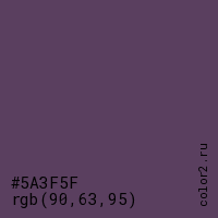 Цвет #5A3F5F в цветовой модели RGB обозначается тремя октетами (90, 63, 95) в десятичном формате и #5A3F5F в шестнадцатиричном (hex) формате, которые являются интенсивностью красного 90 (hex 5A), интенсивность зелёного 63 (hex 3F) и интенсивность синего 95 (hex 5F).