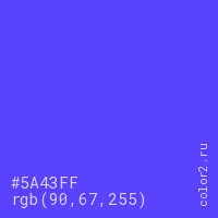 Цвет #5A43FF в цветовой модели RGB обозначается тремя октетами (90, 67, 255) в десятичном формате и #5A43FF в шестнадцатиричном (hex) формате, которые являются интенсивностью красного 90 (hex 5A), интенсивность зелёного 67 (hex 43) и интенсивность синего 255 (hex FF).