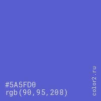 Цвет #5A5FD0 в цветовой модели RGB обозначается тремя октетами (90, 95, 208) в десятичном формате и #5A5FD0 в шестнадцатиричном (hex) формате, которые являются интенсивностью красного 90 (hex 5A), интенсивность зелёного 95 (hex 5F) и интенсивность синего 208 (hex D0).