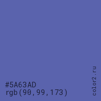 Цвет #5A63AD в цветовой модели RGB обозначается тремя октетами (90, 99, 173) в десятичном формате и #5A63AD в шестнадцатиричном (hex) формате, которые являются интенсивностью красного 90 (hex 5A), интенсивность зелёного 99 (hex 63) и интенсивность синего 173 (hex AD).